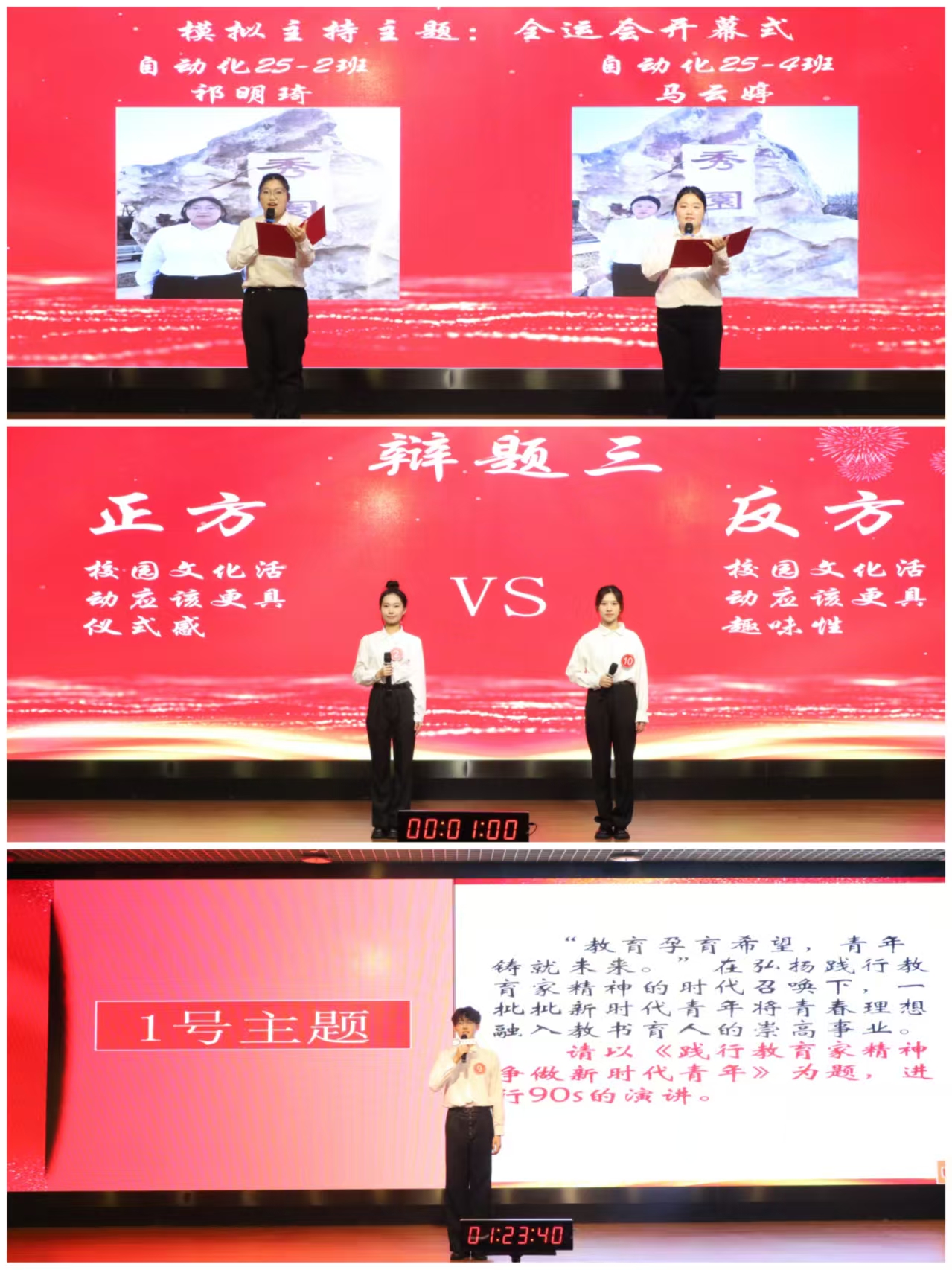 比赛设置模拟主持、主持辩论、即兴评述三个环节,层层递进考验选手综合素养。第一环节,六组选手围绕学风建设、消防安全、红色教育等六大主题开展模拟主持,结合亲身经历诠释青年视角,评委从专业角度给予内容呈现与主持技巧的针对性指导;第二环节,晋级的四组选手交锋亮剑,围绕大学生学习模式、青年能力提升等四大辩题开展辩论主持,在思想碰撞中展现逻辑思辨力,评委从临场应变、立论总结等方面给予充分肯定;第三环节,晋级的六位选手随机抽取教育家精神、抗战精神、科大精神等六大主题开展即兴评述,快速梳理逻辑、结合自身的专业学习引经据典,精彩表现赢得现场阵阵掌声。